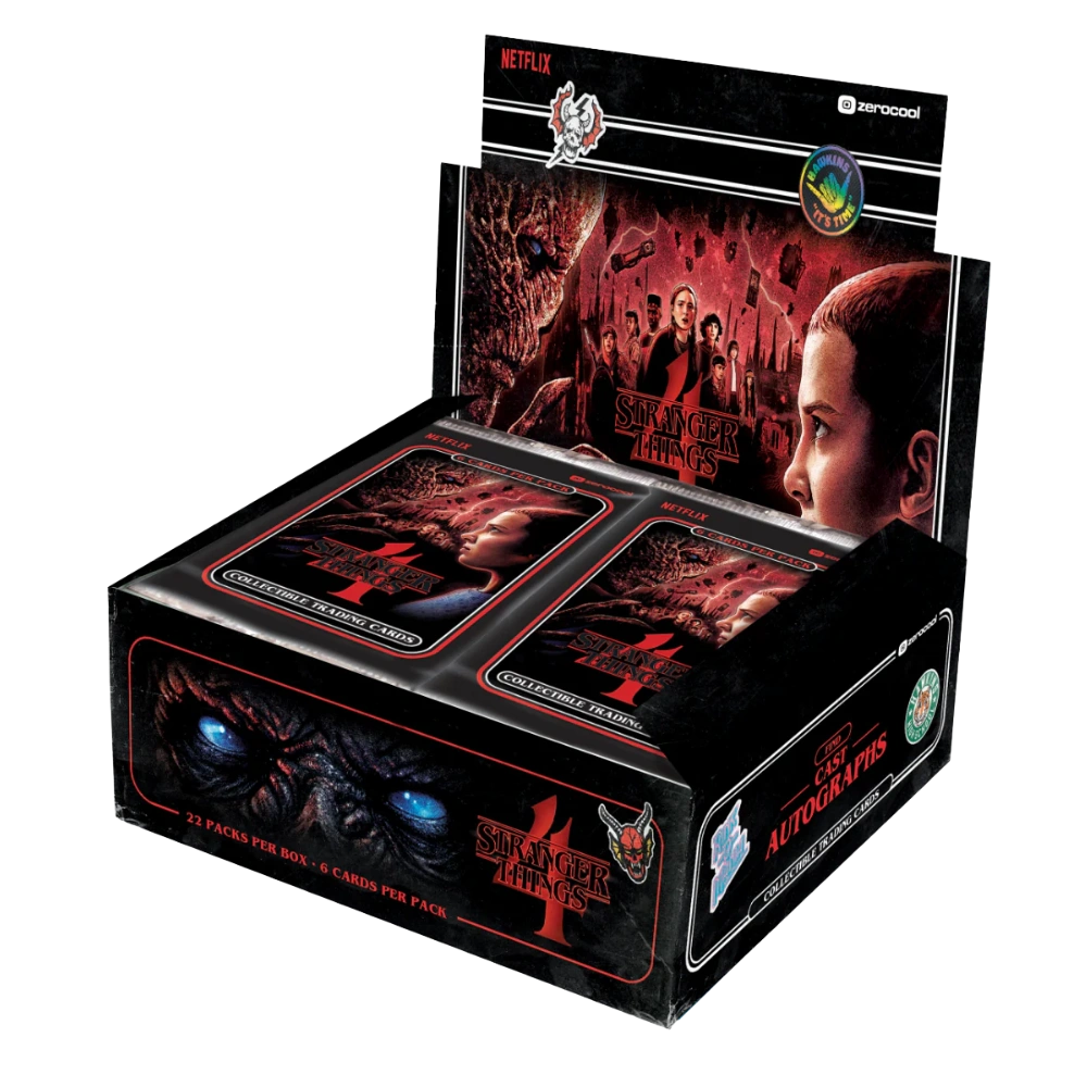Erlebe die packende vierte Staffel von Stranger Things in Sammelkartenform! Diese Hobby Box bietet ein 100-Karten-Base-Set, ergänzt durch spannende Parallels, exklusive Inserts wie Vecna’s Curse oder Upside Down sowie seltene Autogramme und Relics der Stars und echten Screen-Used Elemente.